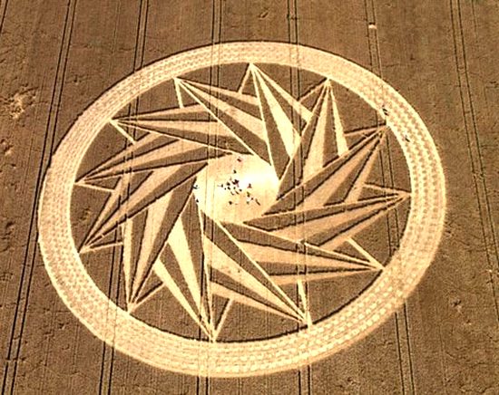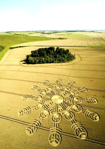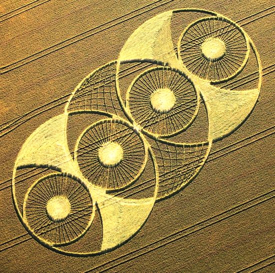 Bu oluşumda, merkezi, dairesel bir alan düzleştirilmiş ve iki eşmerkezli daire ile çevrelenmiştir. Bu dairelerin üstüne ikizkenar bir üçgen yerleştirilmiştir; bu üçgenin her bir köşesinde farklı bir dairesel model bulunmaktadır. Bunlardan biri basit bir çember, diğeri 6 kollu bir fırıldak, sonuncusu ise ilginç bir spiral şeklindedir. Tüm oluşum 190 metre genişliğindedir. Wiltshire’ın Alton Barnes bölgesindeki Milk Hill’de ortaya çıkan ve “Galaksi” adı verilen ekin çemberi de oldukça ilgi çekicidir. Bu şekil, bir spiral içine kusursuz bir biçimde yerleştirilmiş 400’den fazla çemberden oluşmaktadır. Tüm oluşum 450 metre uzunluğundadır, içindeki çemberlerin çapları ise 30 cm ila 21 metre arasında değişmektedir. “Oluşumda 400 çember bulunduğu ve bunlardan bazılarının çapının 20 metreyi geçtiği düşünülürse, her 30 saniyede bir tane çember çizilmiş olmalıdır ki bu sadece düzleştirme için harcanacak zamandır. Bu oluşum sınırları zorlamaktadır. Geleneksel açıklamalar bu noktada yetersiz kalmaktadır.”